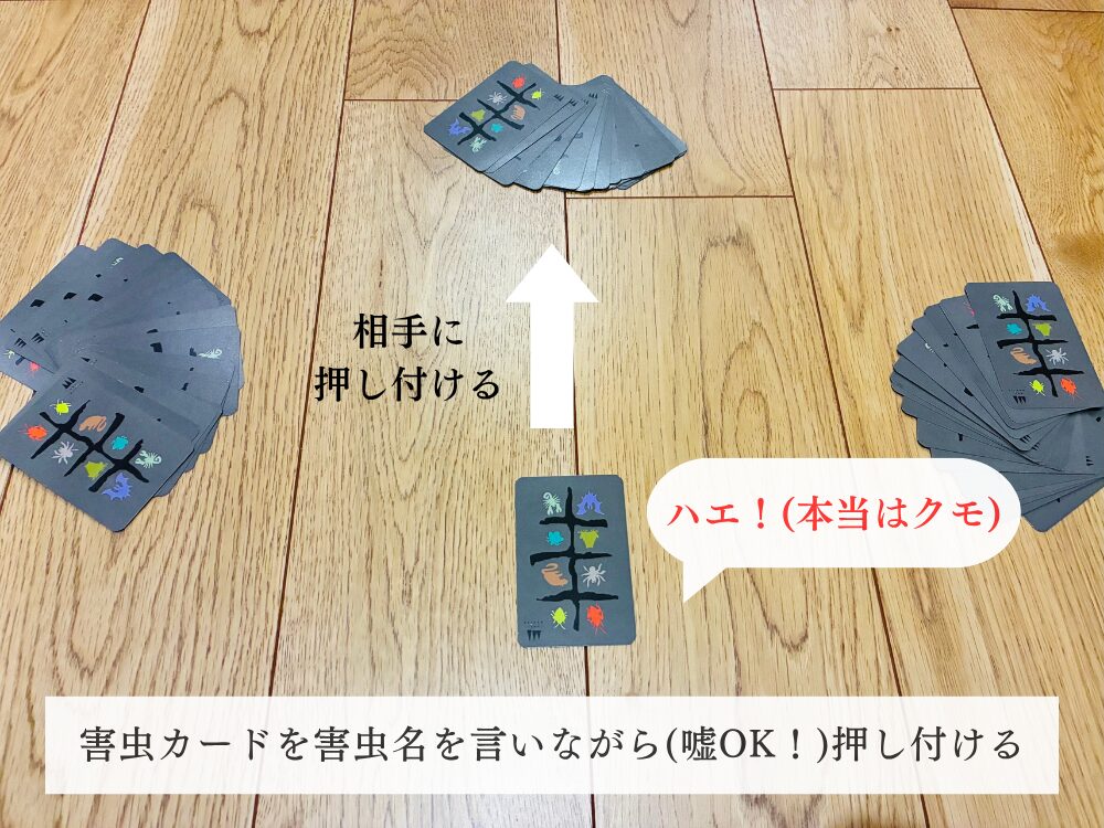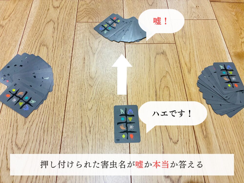 害虫カードを害虫名を言いながら相手に押し付ける時、嘘をついてもOKなのがおもしろいポイント!
