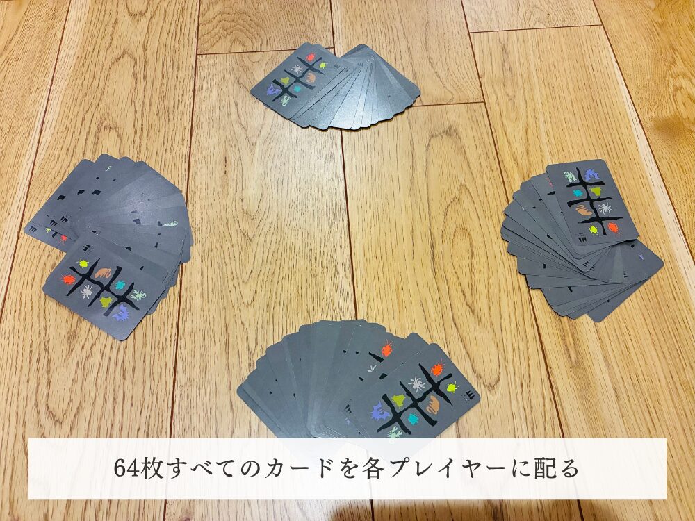 ゲームの準備として、各プレイヤーに64枚のカードを配ります。