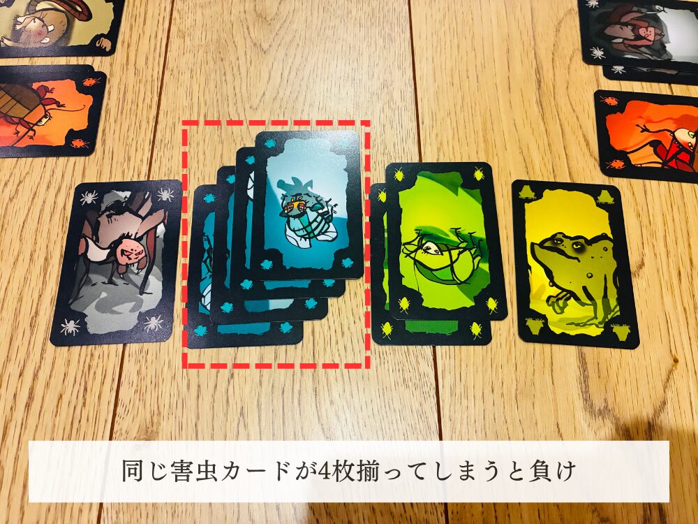 同じ害虫カードが4枚揃った人が負けになります。(2人プレイの場合、同じ害虫カードが5枚揃うと負け)