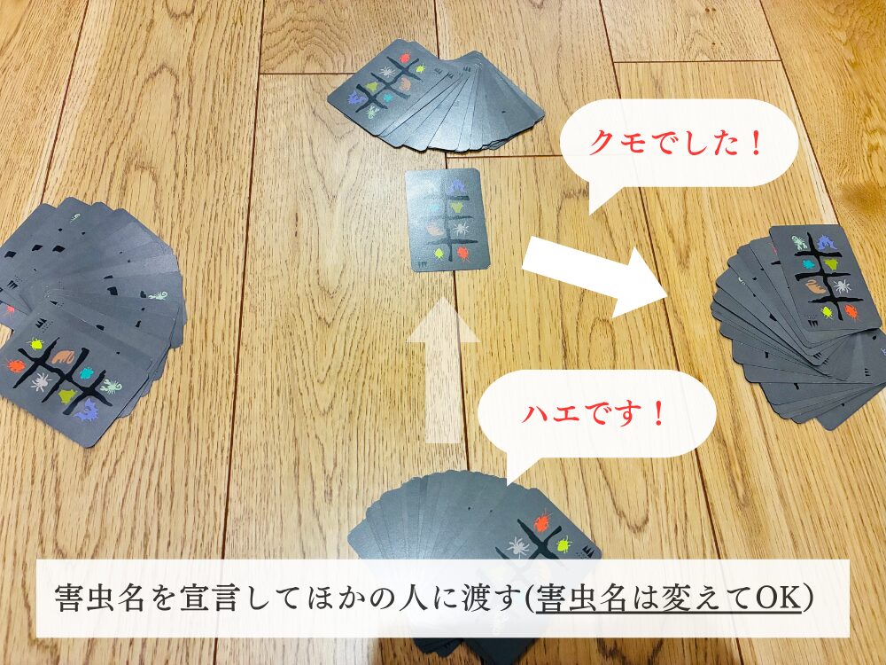 スタートプレイヤーは、手札の害虫カードを任意の相手に害虫名を言いながら渡します。