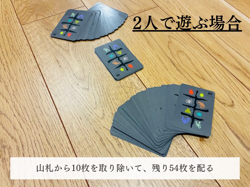 2人で遊ぶ場合、山札から10枚をランダムに取り除いて、残りの54枚を配って遊びます。