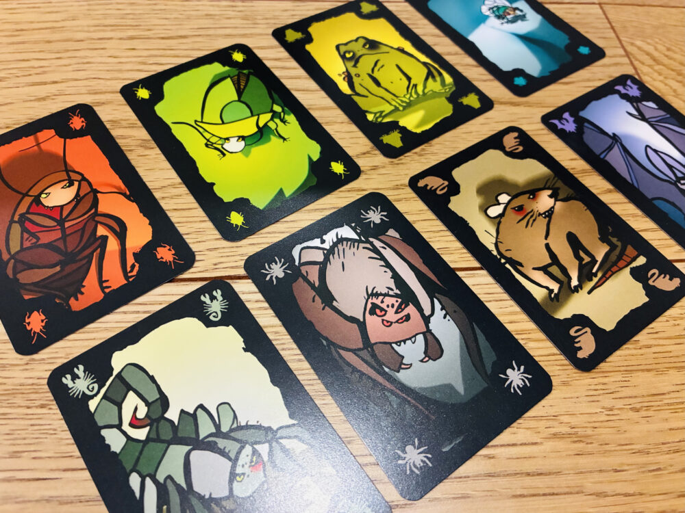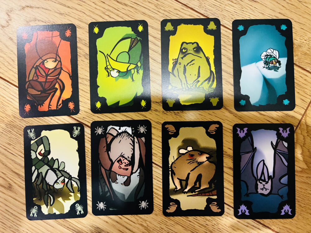 害虫カードは、「ゴキブリ・カメムシ・カエル・ハエ・サソリ・クモ・ネズミ・コウモリ」の8種類あります。