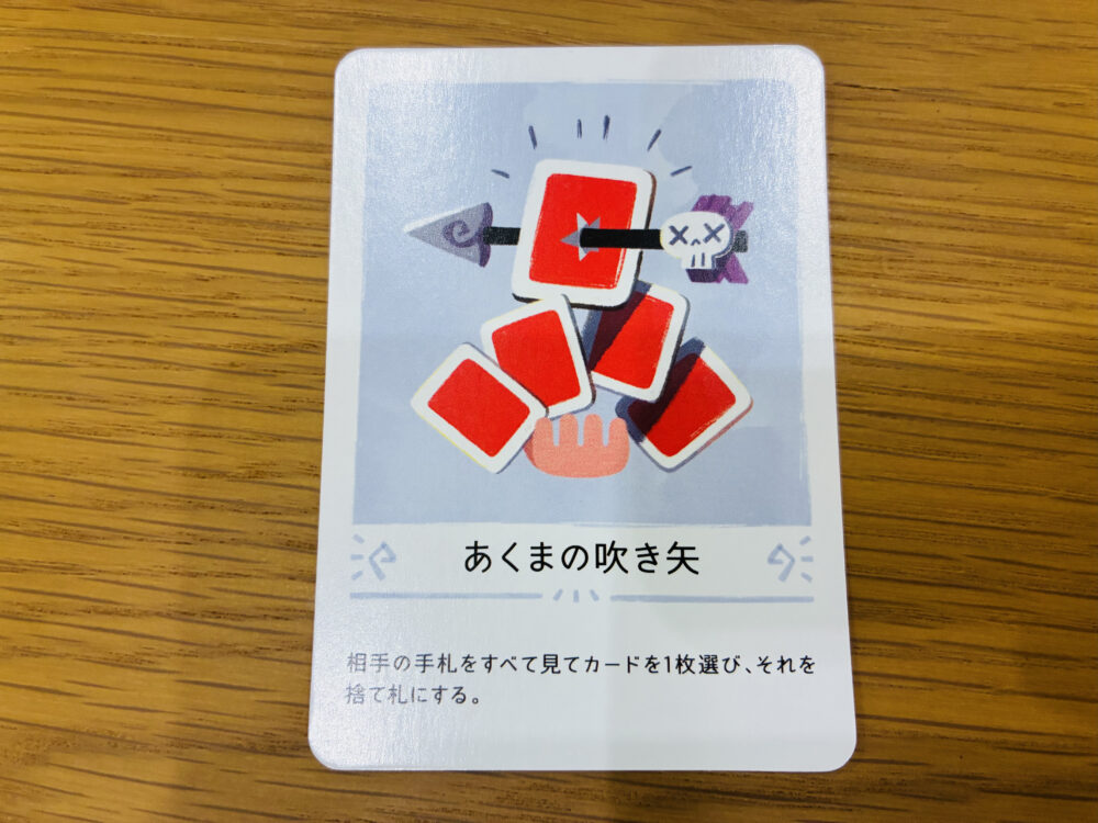 ![]() ![]() あくまの吹き矢 | 相手の手札をすべて見てカードを1枚選び、それを捨て札にする。 |