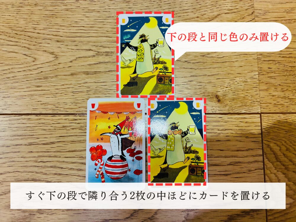 新たに置くカードは、下の2枚どちらかと同じ色のペンギンカードでなければいけません。