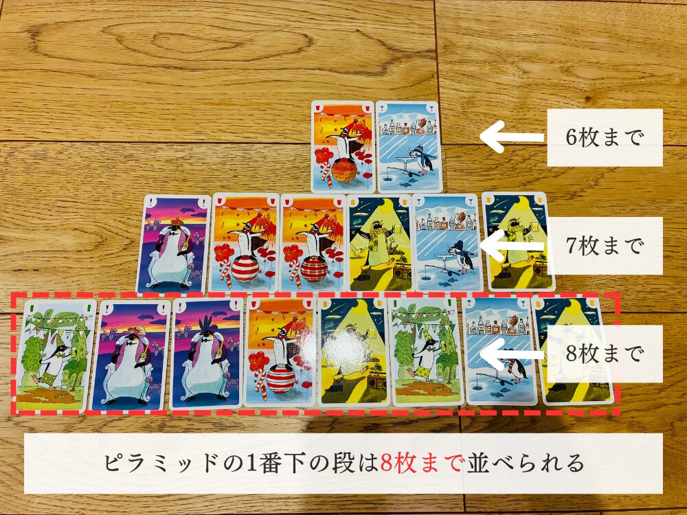 ピラミッドの1番下の段は、8枚までペンギンカードを並べることができます。