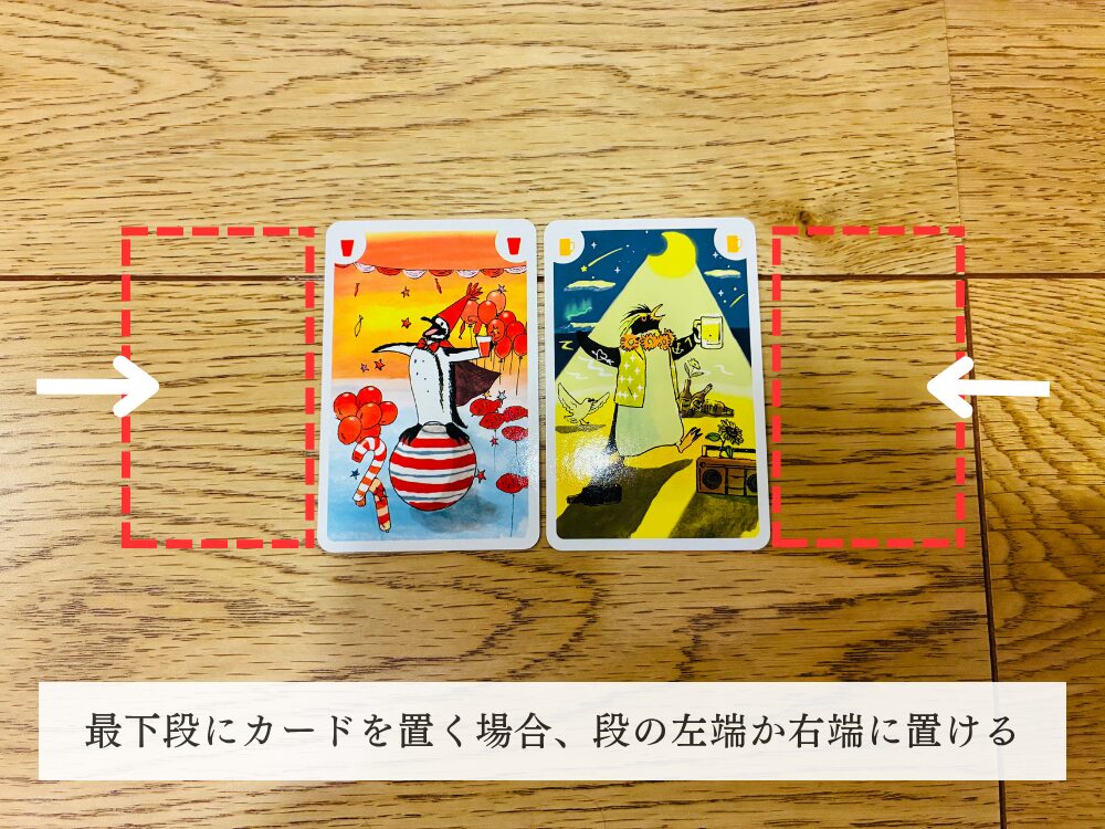 最下段にカードを置く場合、置いてあるカードの右端や左端に置くことができます。