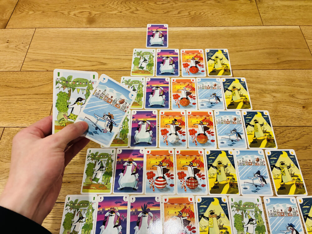 ルールは超簡単で、順番に手札から1枚ずつペンギンカードを出してピラミッドを作っていくだけ。