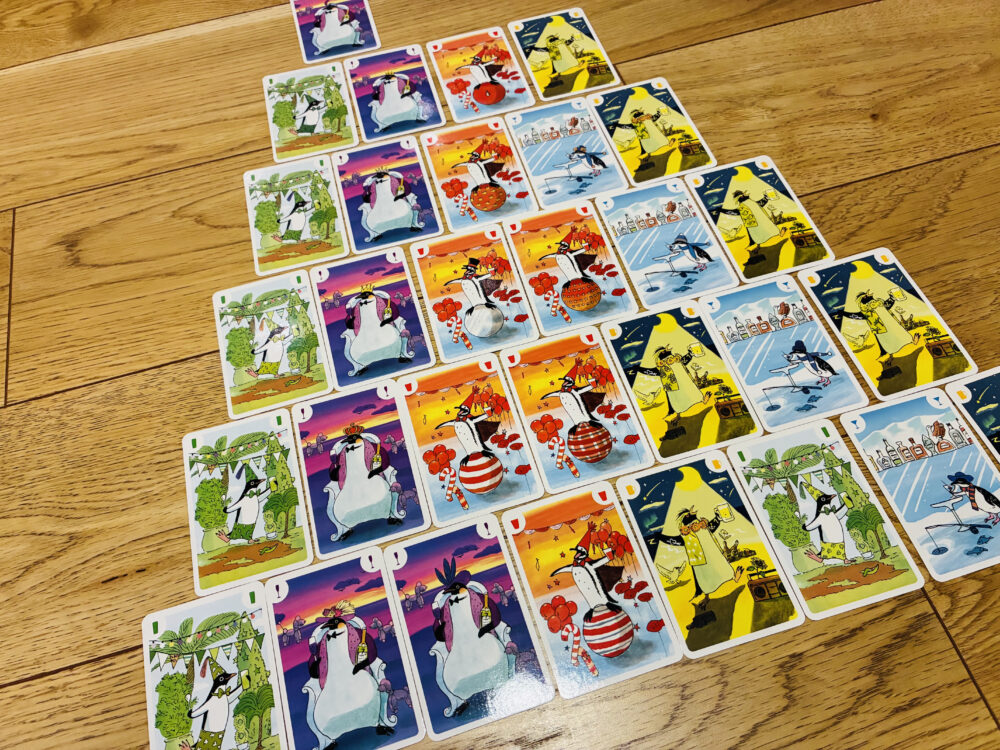 ペンギンパーティは、5色のペンギンカードをうまく配置してピラミッドを作りながら、手札をできるだけ減らしていくボードゲームです。