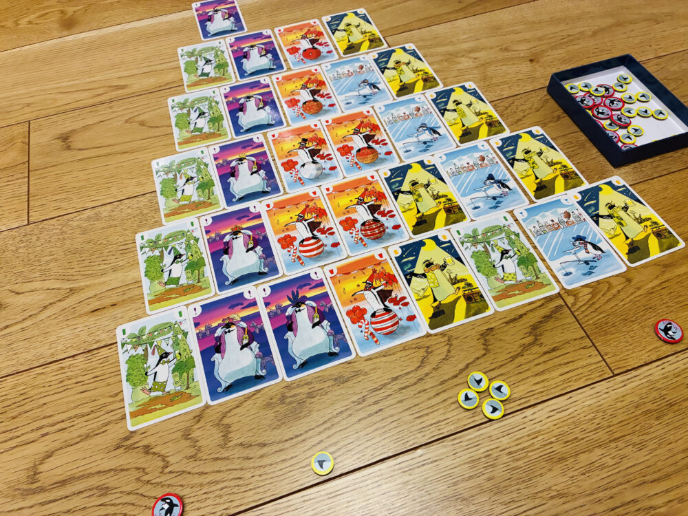 ペンギンパーティは、5色のカードでピラミッドを作りながら手札を減らす、シンプルながら悩ましいボードゲームです。