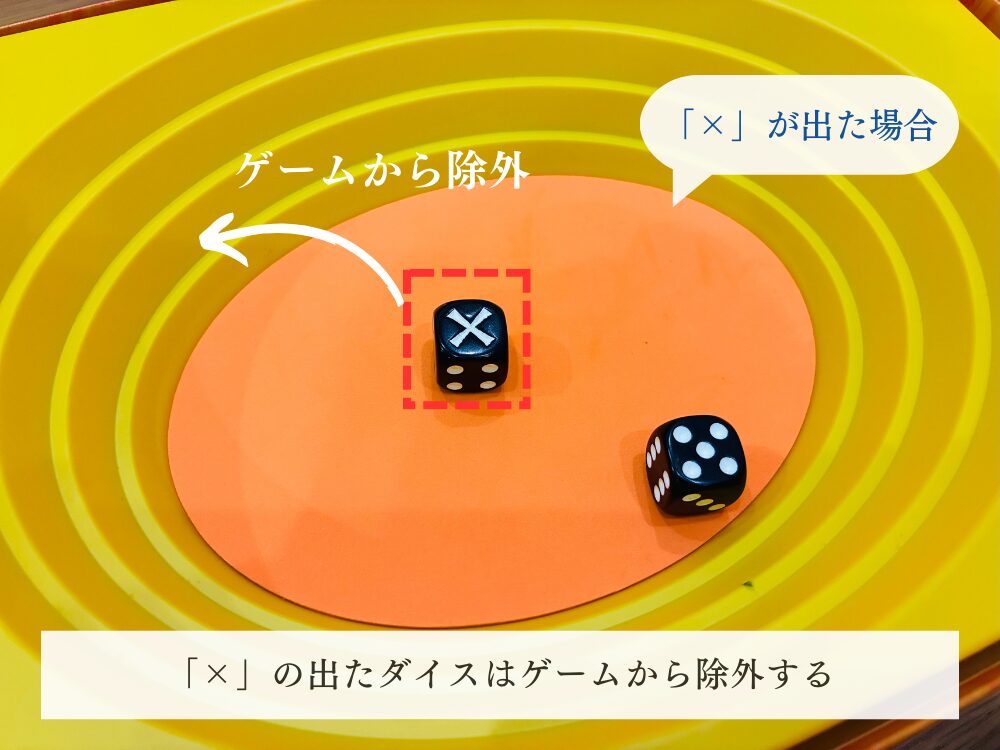 「×」の目が出た場合、「×」の目のダイスをゲームから除外します。