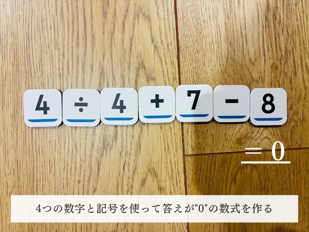 ゼロサムは、4つの数字と”+-×÷()”の記号をうまく使って、答えが0になる数式をいち早く作るボードゲームです。