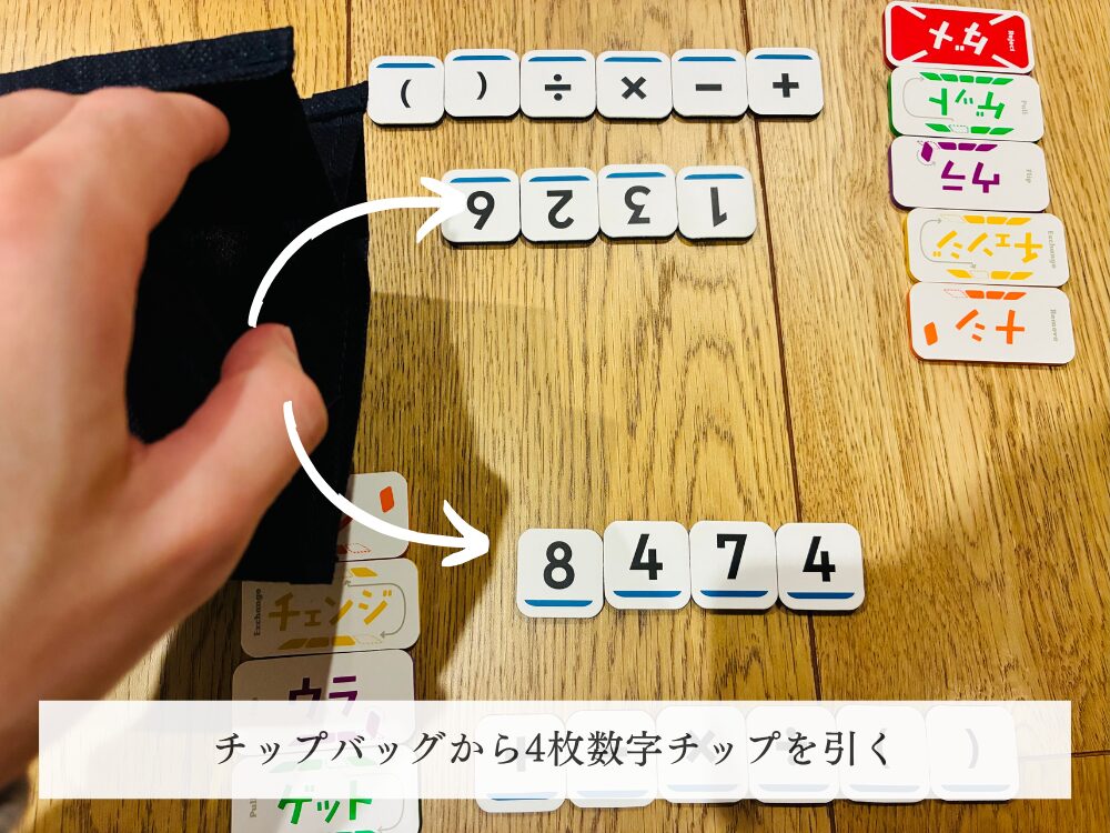 チップバッグから、各4枚ずつ数字チップを引きましょう。