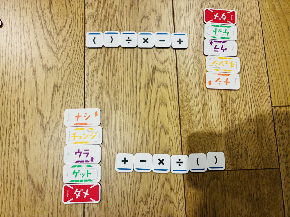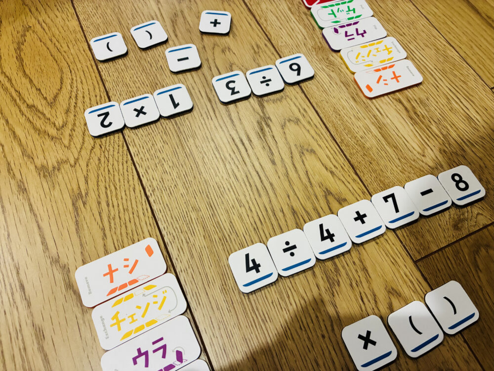 ゼロサムは、数字と”+-×÷()”の記号をうまく使って、答えが0になる数式を作るボードゲームです。