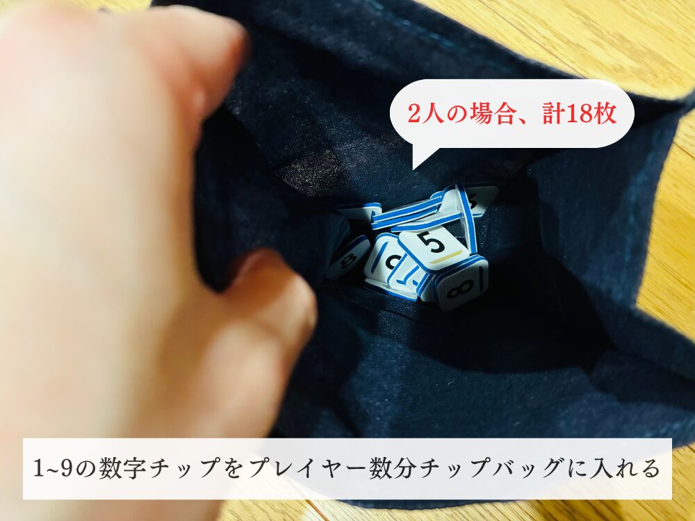 プレイヤー1人につき「1~9の数字チップ1枚ずつ」をチップバッグに入れます。